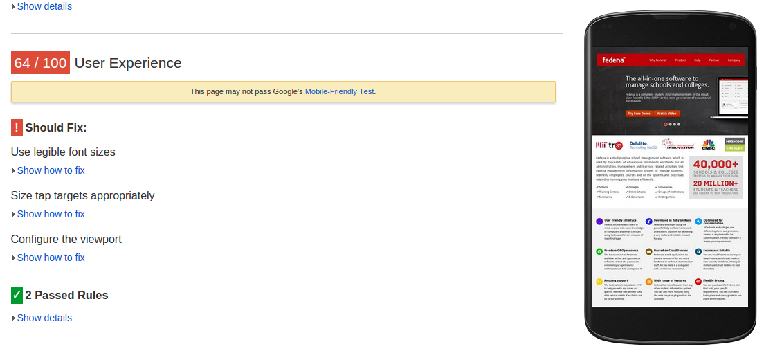 The above image shows the user experience our page (www.fedena.com) provided with respect to mobile users. It clearly depicts that the site is not mobile-friendly. Mobile friendly websites have gained so much importance and popularity that Forbes has included it in their marketing checklist. Delivering audience the content they want, within the context they are viewing it, is the one thing any business should take care of.